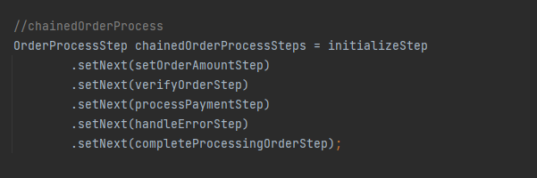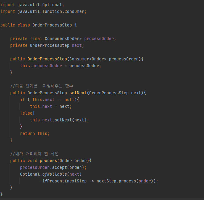 - 위 코드가 chain of responsibility 패턴을 적용하기 위한 구조로써,