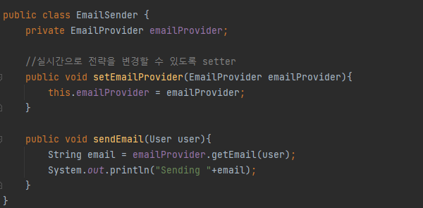: 여러 전략 구현체들을 설정할 수 있도록 setter 메서드 제공 (setEmailProvider)
