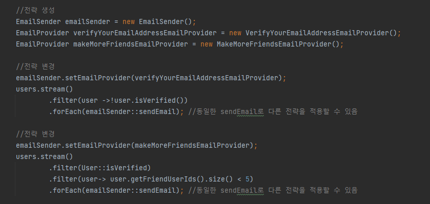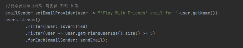- emailSender.setEmailProvider(makeMoreFriendsEmailProvider) 로 설정하여 나온 결과가 다름을 알 수 있다.