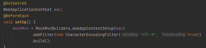 Controller 에 대한 테스트를 진행하기에 앞서, MockMvc 에 인코딩 필터를 추가하면 된다. 아래와 같이 MockMvcBuilders 에서 addFilter를 이용하여, CharacterEncodingFilter를 추가하여 사용하면 한글깨짐현장을 해결할 수 있다.