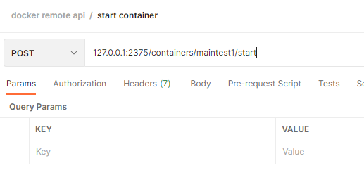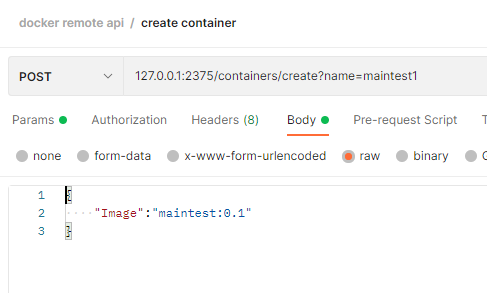 - container 를 생성하기 위해서는 Image가 있어야 하며, Request Body에 어떤 Image로 container를 생성할 것인지 작성하면된다. maintest:0.1 은 테스트 용으로 만든 image 파일이며, query parameter 의 name 은 생성할 container 의 명을 지정한다. option이며, 없으면 Docker에서 알아서 생성해준다.