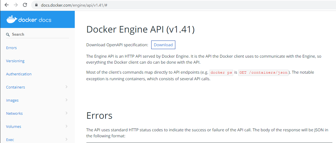 Docker Engine API 는 위 링크( Develop with Docker Engine API )에서 Docker 버전에 맞는 API 문서를 선택하여 확인하면 된다.