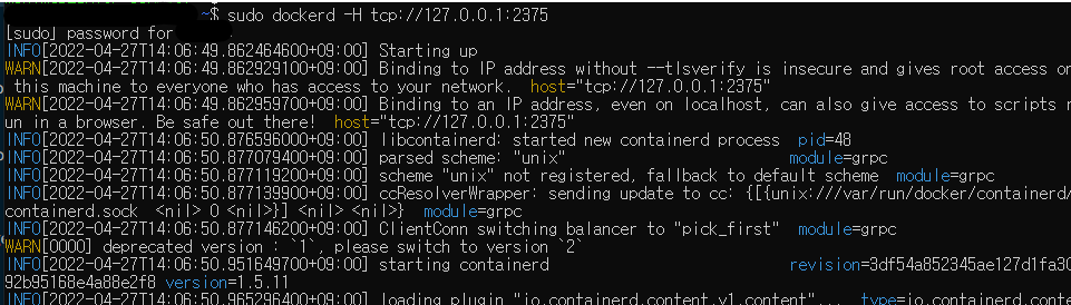 $sudo dockerd -H tcp://127.0.0.1:2375