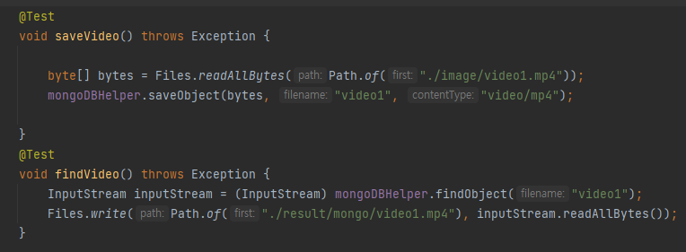MongoDB에서 이미지와 영상은 동일한 코드로 저장되고, 불러올 수 있다. 아래는 영상에 대한 저장 및 불러오기 테스트 코드이며, 이미지와 다르지 않다는 것을 확인할 수 있다.