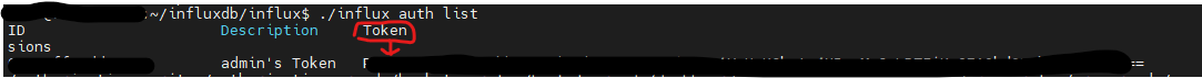influx 가 설치된 경로로 진입하여, ./influx auth list 명령을 실행하면, 등록된 모든 Token 정보들이 출력된다.