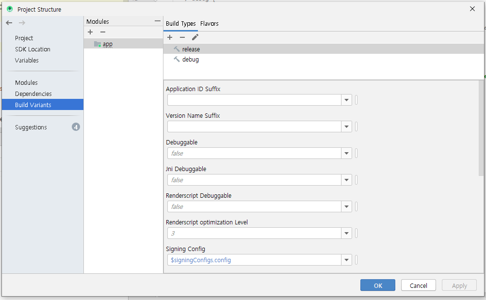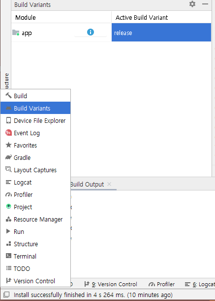 1. android studio 하단의 네모 표시나 Project 우클릭 후, "Open Module Settings" 에 들어가서 BuildeType release로 변경하여 실행하면 끝.