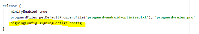 2. android{ buildType { .... }} 내부 release 내에 아래의 singingCofig 부분 추가 작성