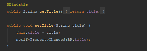 이를 이용하여, 변경여부에 따른 알림을 원하는 속성의 setter에 notifyPropertyChanged()메서드를 등록하고, getter에는 @Bindable을 할당하여, 변경에 따른 알림을 받을 수 있도록 한다.