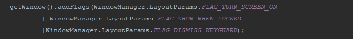 FLAG_TURN_SCREEN_ON flag는 화면이 꺼져있는 동안에는 Activity가 STARTED 에서 STOPPED 로 전환된다. 따라서 이를 방지하기 위해 API27부터는 setTurnScreenOn 메소드를 이용한다. 아래의 그림은 적용된 코드와 activity의 lifecycle을 출력한 내용이다. FLAG_TURN_SCREEN_ON flag를 적용한 부분의 lifecycle을 확인해보면 activity의 lifecycle이 onStart -> onStop으로 전환된 것을 확인할 수 있다.