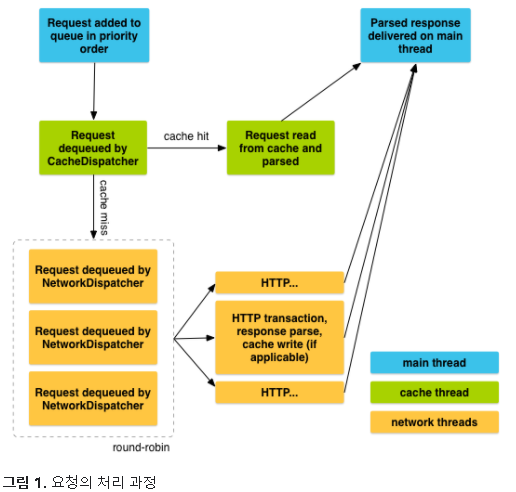 Volley는 cache proccesing thread 및 network dispatch thread들을 포함하는 thread pool을 실행