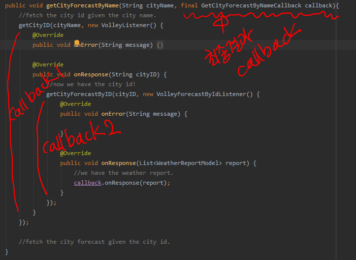 ※ Volley의 MessageQueue는 background에서 데이터를 받기 때문에 main thread에서 값을 받으려면 JAVA의 callback을 사용하게 되고, 여기서 callback 지옥을 경험하게 된다. 그래서 이 동영상에서는 다른 언어에서 지원하는 라이브러리를 사용하여 callback 지옥에서 벗어나라고 추천한다. 현재 rxAndroid를 공부하고 있는데 이때 사용하면 참 좋을 것 같다. 아래 코드가 callback에 callback을 호출하는 부분이다.