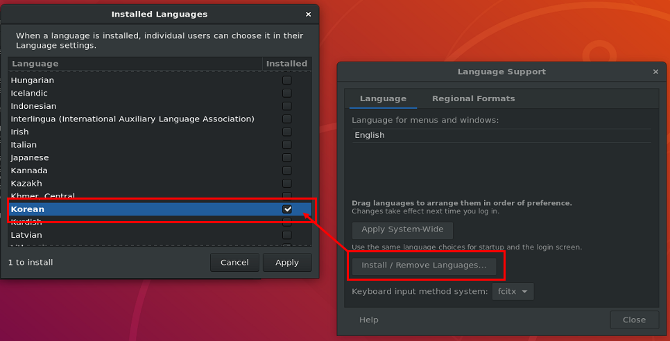 - Install/Remove Languages 에서 Korean 선택 후 Apply (이후에 사용자 인증해주면 적용됨)