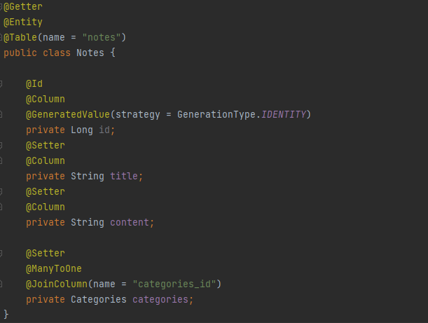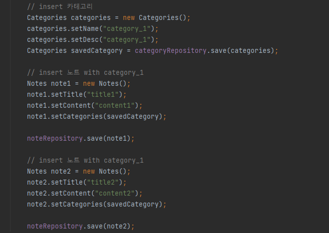 Category 에서도 데이터 접근이 가능하도록 Note에 대한 정보를 설정해준다. Category 입장에서는 일대다로 접근하므로, Category 내에 있는 Note 필드에 @OneToMany를 설정하고, 관계를 주도하는 Entity가 아님(non-owning side Entity)을 알리기 위해 mappedBy 속성을 추가한다.
